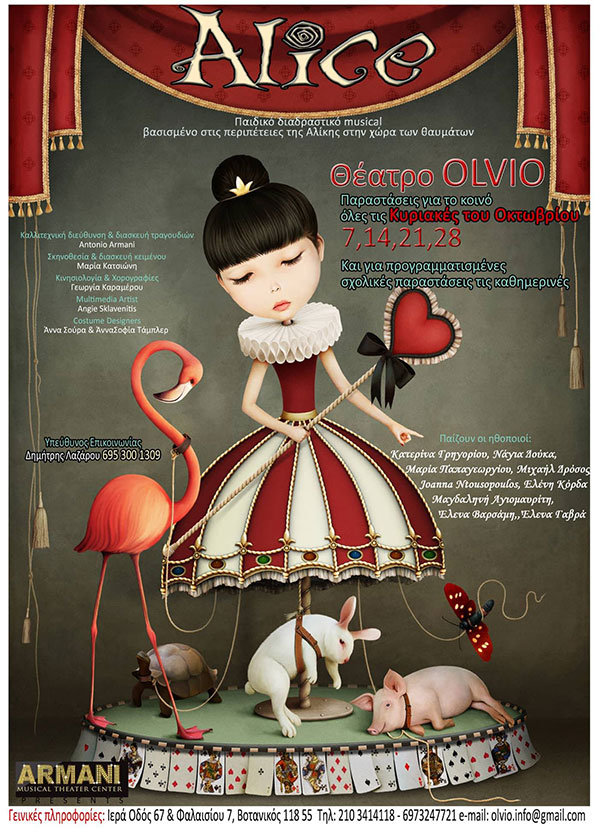 Το ARMANI MUSICAL THEATER CENTER του ΑΝΤΟΝΙΟ ΑΡΜΑΝΙ με πλούσιο βιογραφικό και συνεργασίες όπως Andrew Lloyd Webber και Franco Zeffirelli παρουσιάζει την υψηλής αισθητικής μουσικοθεατρικοχορευτική, διαδραστική παράσταση για παιδιά «ALICE» σε σκηνοθεσία της βραβευμένης και με πολλές παιδικές παραστάσεις στο ενεργητικό της, Μαρίας Κατσιώνη, βασισμένη στο κλασικό μυθιστόρημα του Lewis Carroll Alice s adventures in Wonderland (η Αλίκη στη χώρα των θαυμάτων), σ΄ ένα από τα πιο σύγχρονα θέατρα της Αθήνας το ΟLVIO που βρίσκεται Ιερά οδός 67 & Φαλαισίας 7, Βοτανικός.