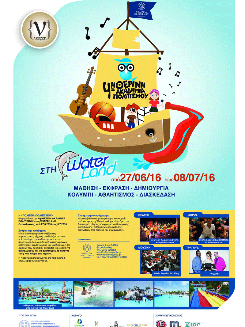 Πληροφορήθηκα πρόσφατα για την 4η «ΘΕΡΙΝΗ ΑΚΑΔΗΜΙΑ ΠΟΛΙΤΙΣΜΟΥ», η οποία θα ξεκινήσει να λειτουργεί στη «WATERLAND» Θεσσαλονίκης, από 27 Ιουνίου 2016 έως 8 Ιουλίου 2016, καλώντας το νεανικό κοινό, να κάνει βουτιές κυριολεκτικά, αλλά και μεταφορικά στις τέχνες και στον πολιτισμό!!!