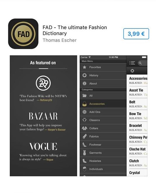 Είμαι σίγουρη ότι έχετε αναρωτηθεί πολλές φορές ποια είναι η διαφορά μεταξύ των υφασμάτων ή των υφών σε ένα ρούχο. Έρχεται λοιπόν το FAD να γίνει το προσωπικό, φορητό σας λεξικό μόδας για να ανατρέχετε σε αυτό οποιαδήποτε στιγμή το χρειαστείτε. Μπορείτε να βρείτε πληροφορίες από όρους της μόδας μέχρι βιογραφικά σχεδιαστών και από το πώς να ράβεις μέχρι την ιστορία της μόδας. Υπάρχουν πάνω από 1,300 όροι στην εφαρμογή που θα σε βοηθήσουν να βελτιώσεις τις γνώσεις σου περί μόδας.