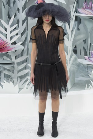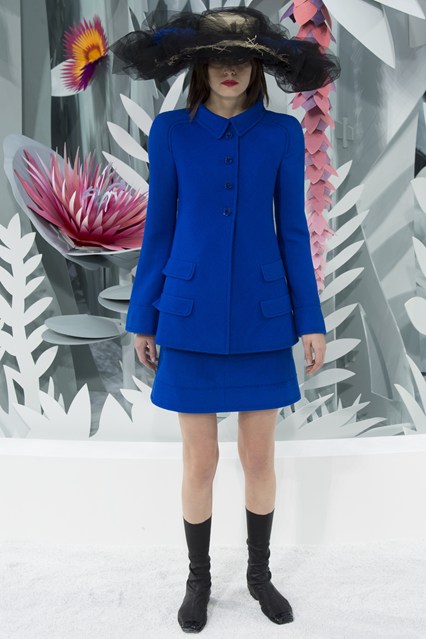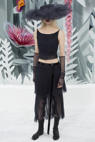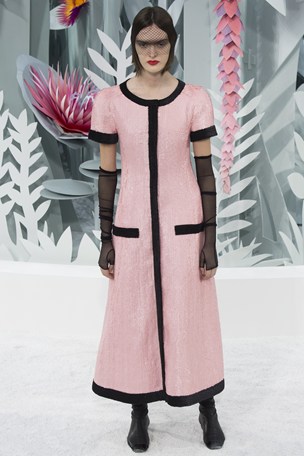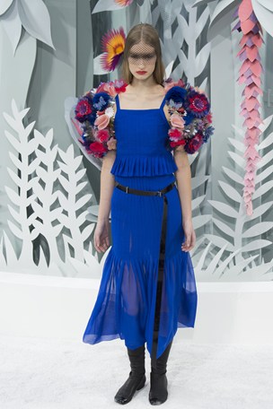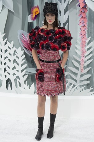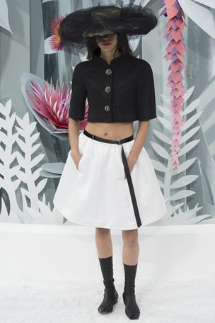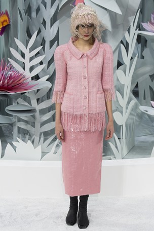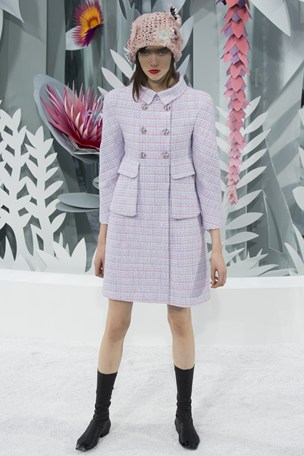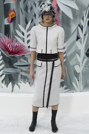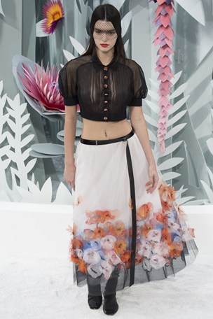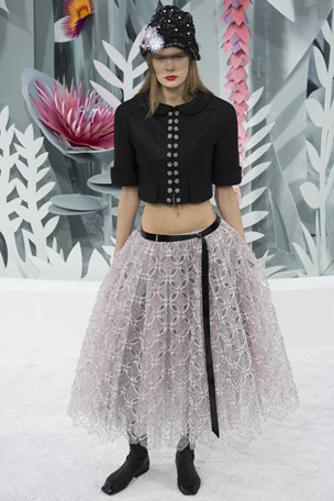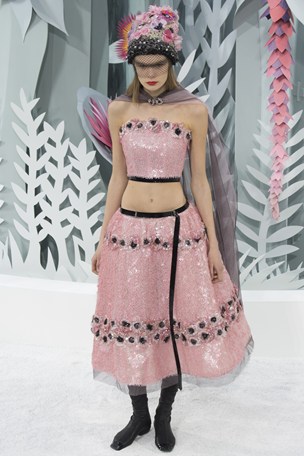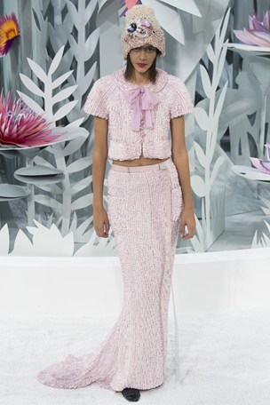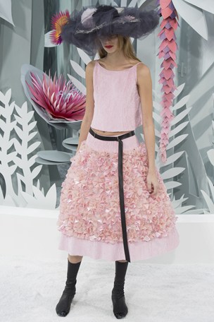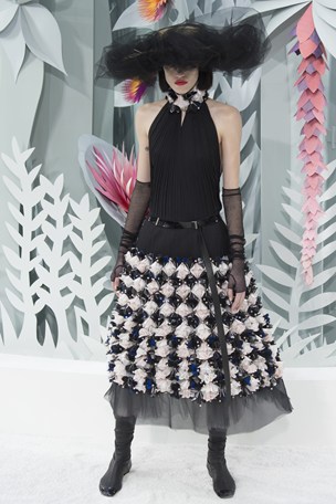 Ένας κήπος από χαρτί για ντεκόρ και λουλουδάτες δημιουργίες στο Haute Couture Fashion Show του οίκου Chanel. Άσπρο, μαύρο, powder pink και color blocking χρώματα με υφάσματα κυρίως από τούλι και το signature tweed του οίκου.