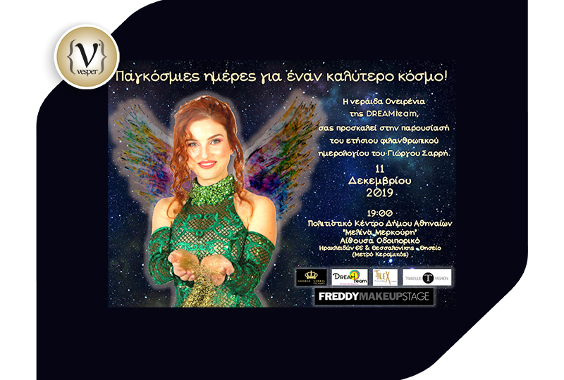 H Νεράιδα Ονειρένια της Dreamteam σας προσκαλεί στην παρουσίαση του ετήσιου φιλανθρωπικού ημερολογίου του Γιώργου Σαρρή με τίτλο ”Παγκόσμιες ημέρες για έναν καλύτερο κόσμο” την Τετάρτη 11 Δεκεμβρίου 2019 στο Πολιτιστικό Κέντρο Δήμου Αθηναίων ”Μελίνα Μερκούρη” στην αίθουσα Οδοιπορικό, στις 7μμ. Ο Γιώργος Σαρρής για 15η χρονιά μέσα από το καθιερωμένο του ημερολόγιο στηρίζει αυτή τη φορά το κοινωνικό έργο της Dreamteam.