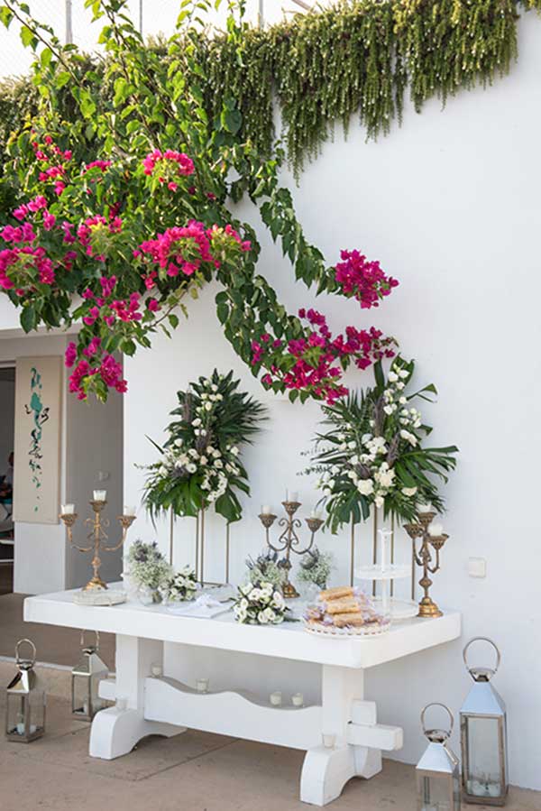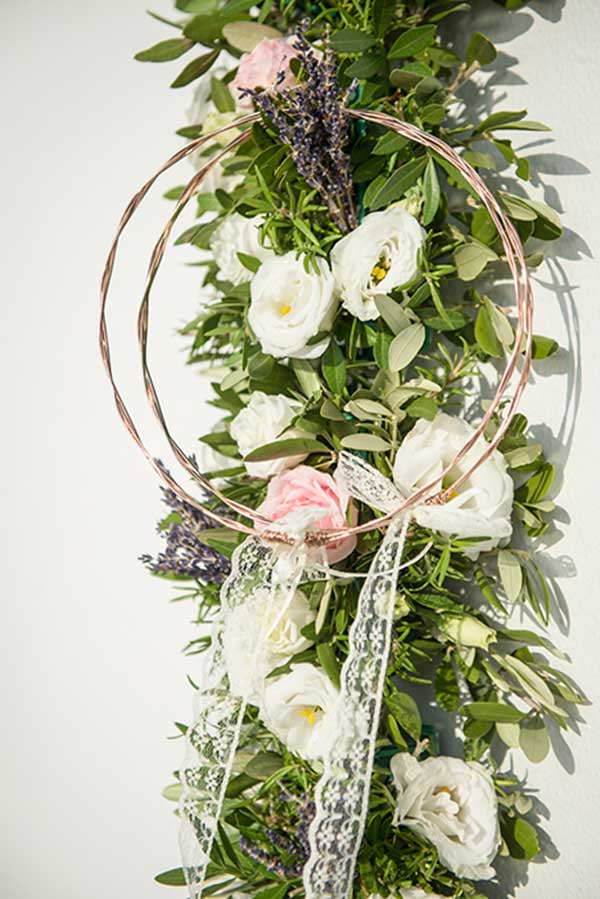 Η νυφική ανθοδέσμη από λευκά άνθη, ελιά και λεβάντα ήταν η κεντρική έμπνευση για τον ανθοστολισμό, τόσο του χώρου δεξίωσης όσο και της εκκλησίας. Τη διακόσμηση συμπλήρωσαν ρουστίκ στοιχεία και φυσικές λεπτομέρειες μετατρέποντας την ατμόσφαιρα σε ειδυλλιακό τοπίο.