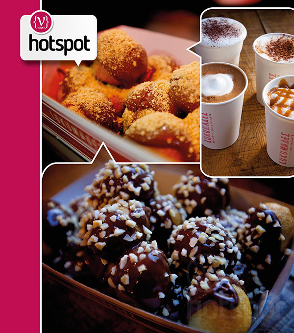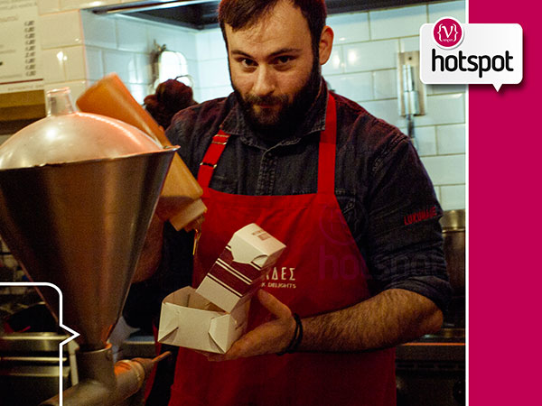 Μπαίνοντας στο μαγαζί, αντιλαμβάνομαι πως πρόκειται για έναν μοντέρνο μίνιμαλ χώρο, ίσως για να έρθει σε έντονη, πλην ενδιαφέρουσα αντίθεση με το ίδιο το προϊόν, τον λουκουμά, που ως ανέκαθεν παραδοσιακό ελληνικό γλυκό, εκπροσωπεί το κλασσικό. Με πλατύ χαμόγελο καθίσαμε στο καλύτερο σημείο, μπροστά από την ανοιχτή κουζίνα, για να απολαύσουμε όλο το τελετουργικό παραγωγής και ετοιμασίας των μερίδων. Το μαγαζί ήταν σχεδόν γεμάτο, όχι μόνο από ανθρώπους, αλλά και από ζεστές μυρωδιές. Αυτό που ακολούθησε δεν είχε προηγούμενο: γεύσεις, υφές, μυρωδιές, εικόνες, τα πάντα είχαν βαλθεί να μας ικανοποιήσουν στην χειρότερη, να μας τρελάνουν στην καλύτερη! Δοκιμάσαμε λουκουμάδες γεμιστούς με σοκολάτα, με επικάλυψη bueno και φουντούκι, λουκουμάδες με ανάμεικτο παγωτό μηχανής, επικάλυψη σοκολάτας και ξηρούς καρπούς, και με γέμιση κρέμας μαστίχα, άχνη και κανέλα.