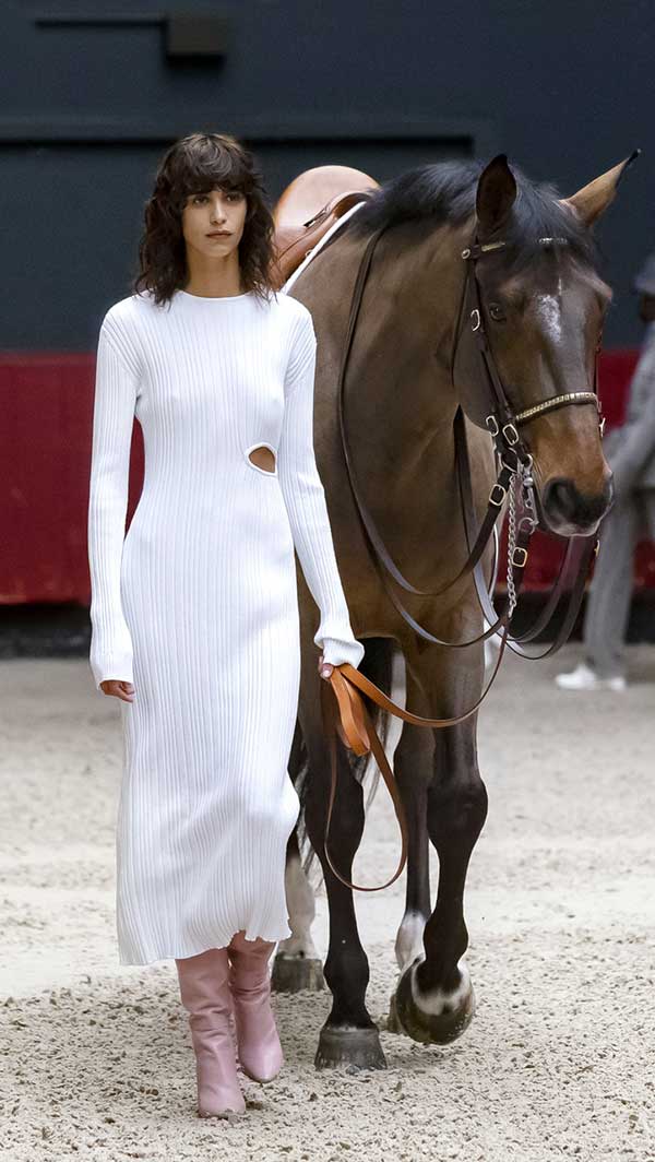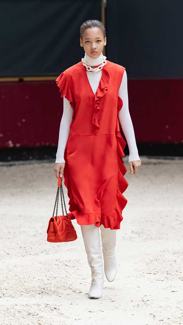 Το σόου άνοιξε η Mica Arganaraz φορώντας ένα μαύρο σακάκι σαφάρι, κόκκινο πουλόβερ και κοντό λευκό σορτς με μαύρες γαλότσες, από τις οποίες ξεχώριζαν οι ψηλές κόκκινες κάλτσες. Η συγκεκριμένη παλέτα χρωμάτων, το στυλ ιππασίας και το παριζιάνικο ύφος επαναλήφθηκαν καθ’ όλη τη διάρκεια της επίδειξης. Η σπορ διάθεση κινήθηκε σε απόλυτη ισορροπία με τα αέρινα midi φορέματα και τα cropped παντελόνια φορεμένα με ψηλές μπότες πάνω από το γόνατο, αποπνέοντας μια εξαιρετικά γυναικεία ατμόσφαιρα μέσα από τις διαφορετικές όψεις του Parisienne χαρακτήρα της Longchamp.