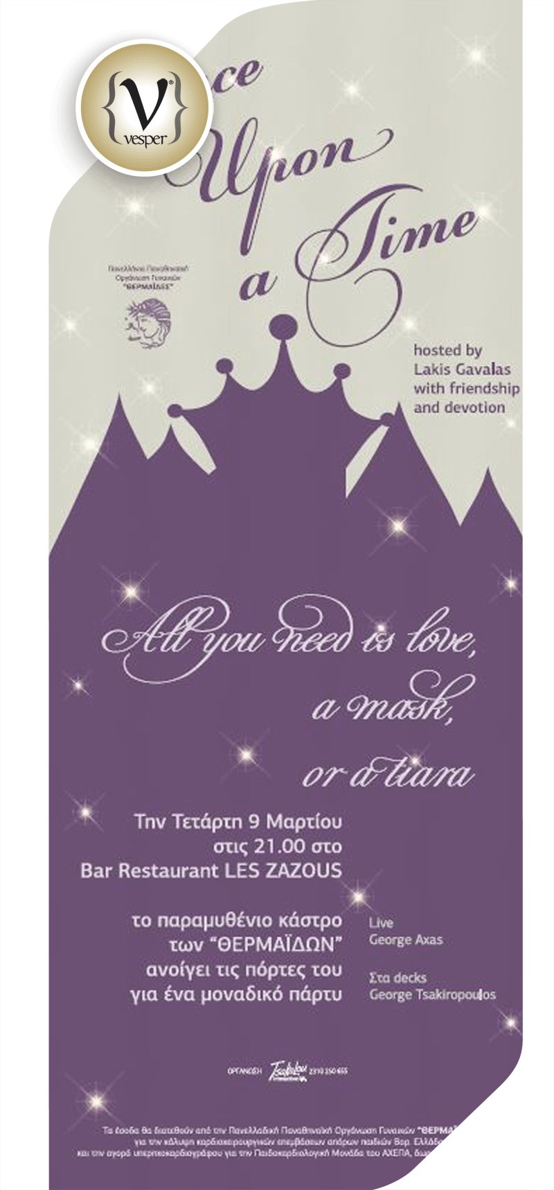Εκτός λοιπόν από τα φημισμένα κάστρα της, πληροφορήθηκα, ότι στη Θεσσαλονίκη υπάρχει ακόμα ένα κάστρο, μαγικό, το κάστρο των Θερμαΐδων, το οποίο θα ανοίξει τις πόρτες του για μια και μόνο βραδιά στο Bar–Restaurant LES ZAZOUS! Προσοχή όμως! Για να μπορέσουμε, να μπούμε μέσα ακούστηκε, ότι χρειαζόμαστε τρία βασικά πράγματα: Τιάρα ή μάσκα και φυσικά αγάπη!