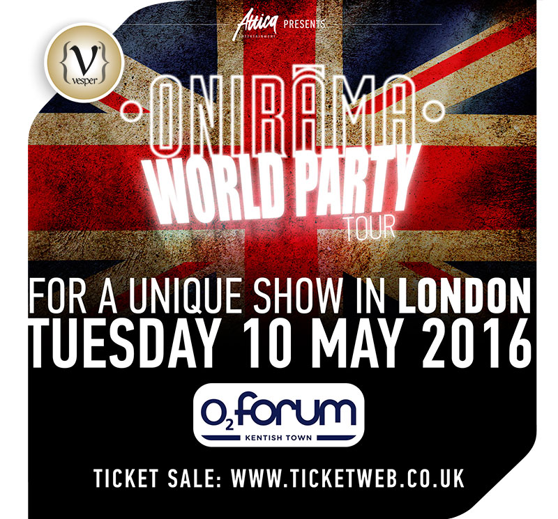 Για μια εντυπωσιακή συναυλία ετοιμάζεται το επιτυχημένο ελληνικό group “ONIRAMA” στο Λονδίνο. Την ενέργεια του WORLD PARTY θα νιώσουν όσοι θα παραβρεθούν την Τρίτη 10 Μαΐου σε έναν από τους σημαντικότερους και ιστορικότερους συναυλιακούς χώρους του Λονδίνου, στο O2Forum Kentish Town.