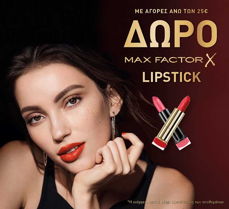 Ειδικά για τον μήνα Δεκέμβριο ανάδειξε τις γιορτινές σου εμφανίσεις με το κατάλληλο μακιγιάζ από τη Max Factor, κάνε αγορές καλλυντικών άνω των 25 ευρώ και πάρε δώρο ένα κραγιόν σε κανονικό μέγεθος! Η προσφορά ισχύει μέχρι εξαντλήσεως των αποθεμάτων.