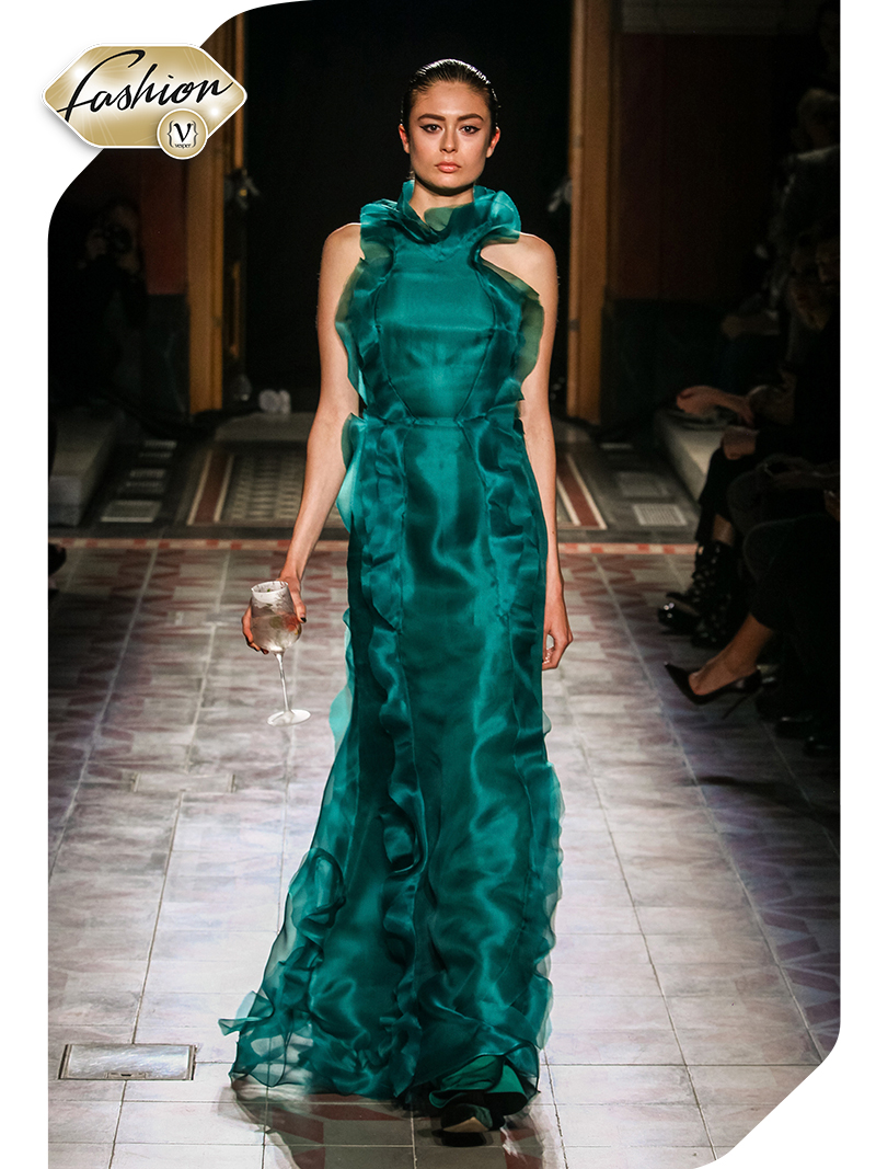 Ένα μοναδικό εκθαμβωτικό πράσινο φόρεμα, αποτέλεσε το κεντρικό κομμάτι της κομμάτι της συλλογής “The Raiven and the Maiden”. Το φόρεμα ήταν , εμπνευσμένο από την απλότητα, την αυθεντικότητα και τη διαφάνεια της φυσικότητας που εκφράζονται μέσα από το νέο manifesto της BELVEDERE VODKA, Relearn Natural. Οι bartenders της βραδιάς, ακολουθώντας τις ίδιες αρχές του νέου manifesto της Belvedere, ετοίμασαν για τους καλεσμένους ένα δροσερό, φρέσκο serve με Belvedere Vodka, γαλλικό κρασί aperitif, ροζ grapefruit, θυμάρι και tonic water, το Belvedere Spritz.