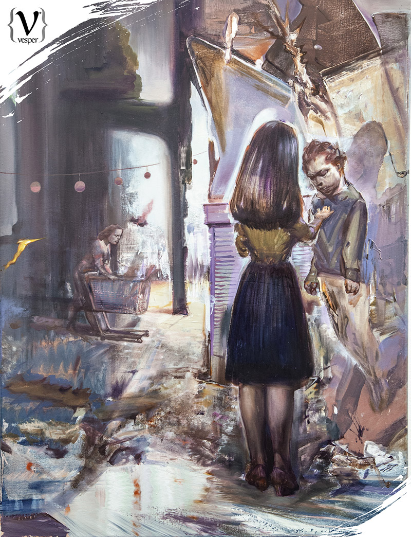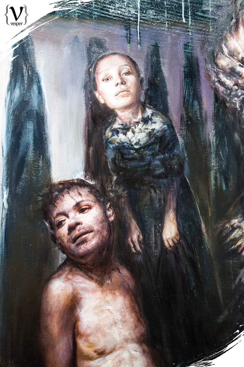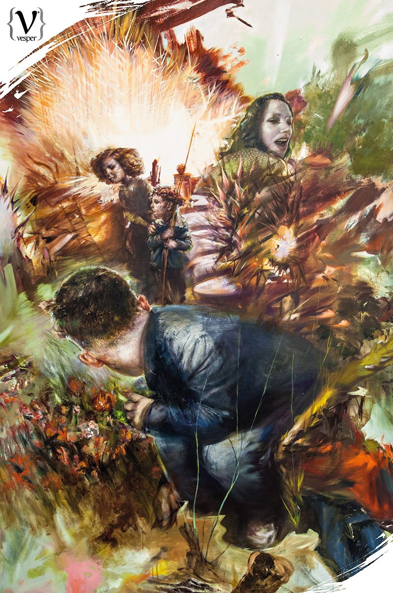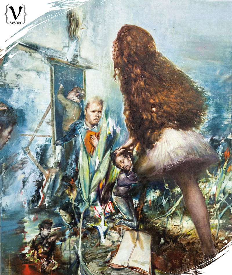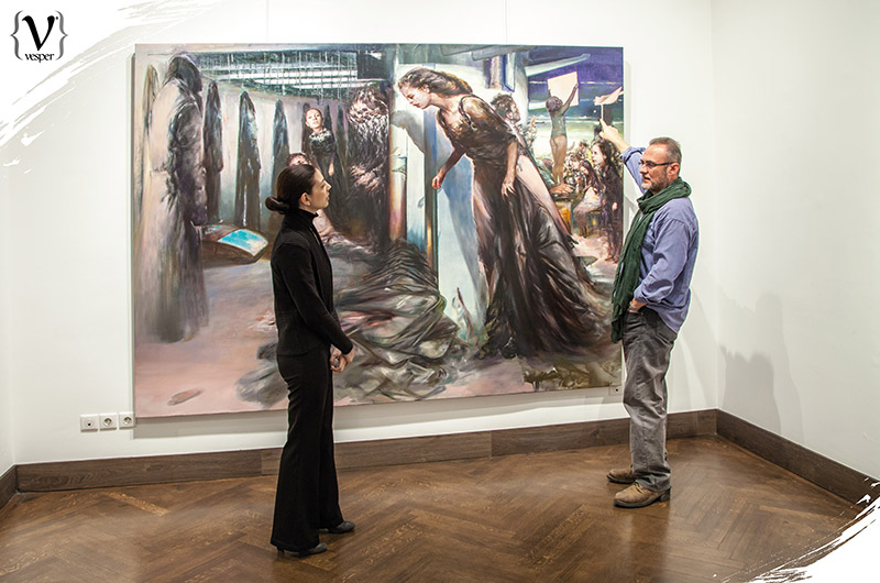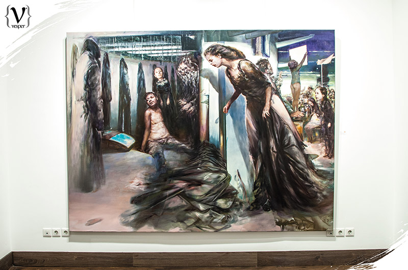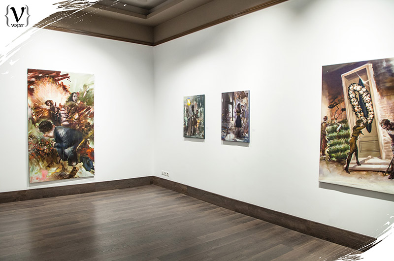 Αυτή η έκθεση είναι δουλειά των τελευταίων δύο-τριών χρόνων. Τα θέματα είναι διαφορετικά μεταξύ τους και προέκυψαν στην πορεία. Όπως είναι και ο τίτλος της έκθεσης “Fluid Frames”, πέραν από τα ρευστά πλαίσια των διαφόρων “ζωγραφικών γλωσσών”, δηλαδή σε ένα έργο μπορεί να υπάρχουν κλασικά στοιχεία, τα οποία να αναμειγνύονται με νατουραλιστικά αλλά και κάποια ποπ αρτ στοιχεία. Συγχρόνως, όμως, και τα πλαίσια ενός έργου είναι ρευστά και μπορούν να συνδέονται με τα όρια των υπόλοιπων έργων. Όταν δημιουργώ ένα νέο έργο έχω στο μυαλό μου όλα τα προηγούμενα. Έτσι μπορείς να βάλεις δίπλα του οποιοδήποτε έργο και να συνδεθούν αρμονικά μεταξύ τους. Μάλιστα αν αλλάξεις το έργο που θα τοποθετήσεις δίπλα του μπορείς να διηγηθείς μια άλλη ιστορία.