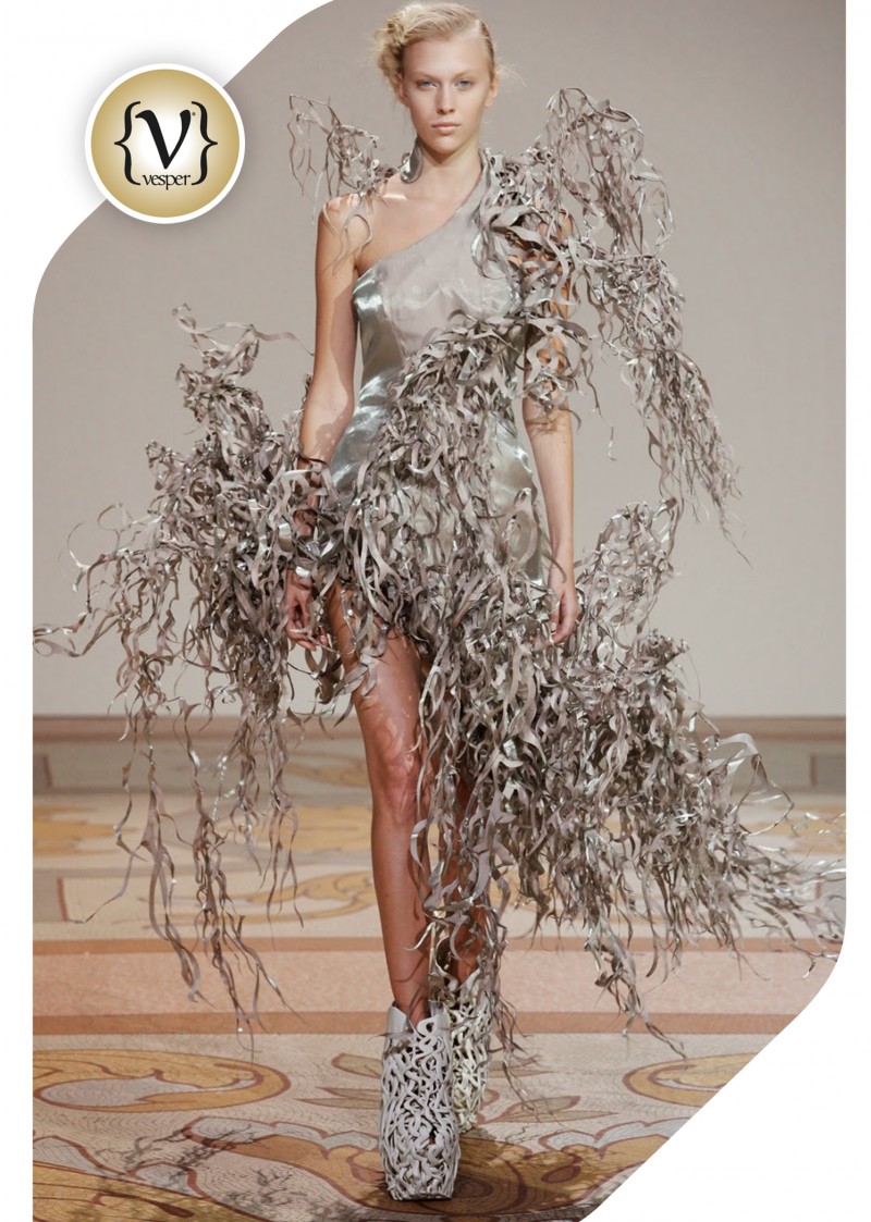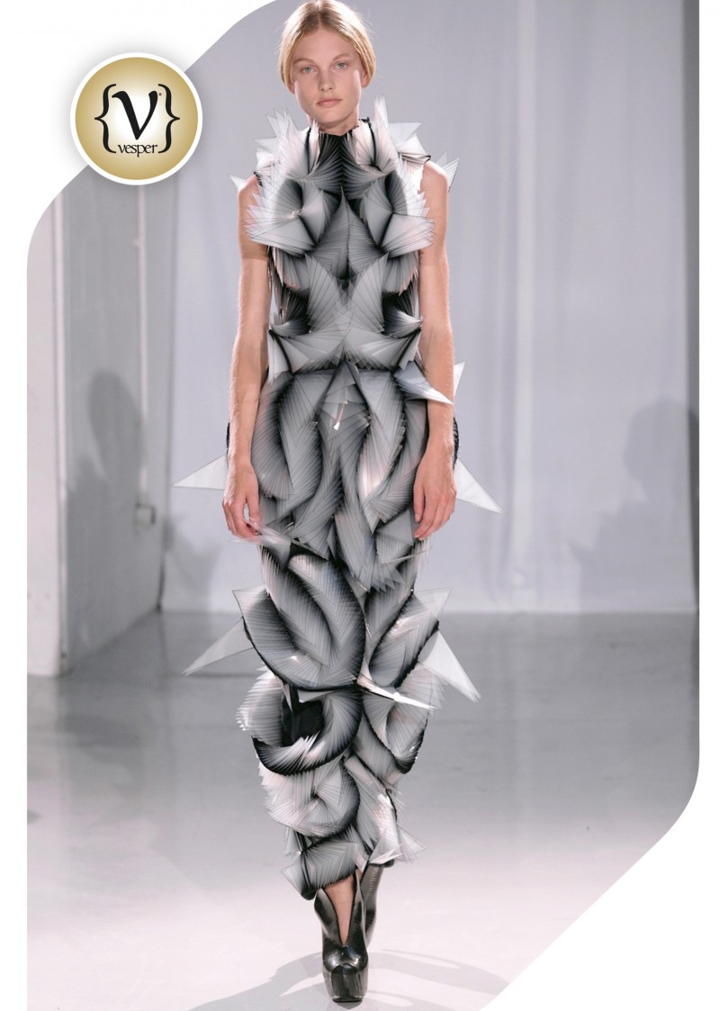 Η Iris Van Herpen αντιλαμβάνεται τη μόδα μέσα από ένα πρίσμα έντονα καλλιτεχνικό, κάτι που είναι έκδηλο στα ντεφιλέ της, όπου προσθέτει πάντα κάτι, που αναγάγει τη πασαρέλα σε υπερθέαμα τέχνης. Πρωτοπόρος στη χρήση 3d printing για τη δημιουργία ενδυμάτων και υποδημάτων εδώ και χρόνια, στη φετινή της κολεξιόν Άνοιξη/Καλοκαίρι 2016, η Iris Van Herpen έστησε ένα σκηνικό σχεδόν εξωγήινο!  Κεντρικό πρόσωπο ήταν η ηθοποιός Gwendoline Christie ή αλλιώς Brienne of Tarth στη γνωστή τηλεοπτική σειρά Game of Thrones, η οποία άφησε τις πανοπλίες για λίγο και ξάπλωσε σε ένα στρογγυλό βάθρο, όπου γιγάντια ρομποτικά γλυπτά έπλεκαν τρισδιάστατα επάνω στο σώμα της ένα διχτυωτό φόρεμα, ενώ γύρω της παρελαύναν τα μοντέλα φορώντας τα επίσης 3d printed ρούχα της συλλογής.