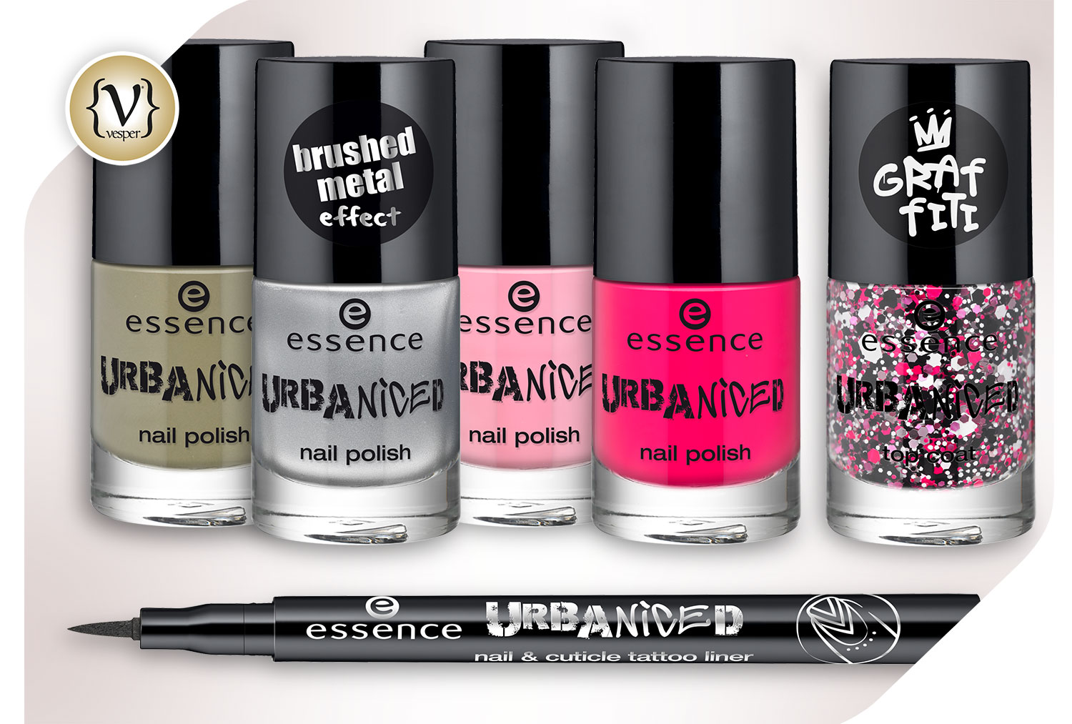 Φυσικά δεν θα μπορούσαν να λείπουν τα nail polish από την συλλογή σε τέσσερα φοβερά χρώματα, για να επιλέξετε αυτό που ταιριάζει κάθε φορά στην διάθεσή σας. Χακί, φούξια, ροζ και ασημί. 01 freak out!, 02 turn heads, baby!, 03 fun and the city και 04 city girls rule!. Το κερασάκι στην τούρτα είναι το σούπερ top coat 01 be my town homie! με το ματ και γυαλιστερό εφέ της νιφάδας σε φούξια, ροζ, λευκές και μαύρες αποχρώσεις φέρνει το graffiti στα νύχια σας.